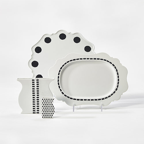This lovely contemporary baroque set of vases can be used together or individually. Designed as a duo, they are stunningly perfect for flowers, gravies, dressings and make a superb oil and vinegar cruet- a seamless pairing with the Dash Serving Platter! Italian architect and designer Paola Navone created this Black and White series for Porzellanmanufaktur Reichenbach, Germany. Ms. Navone has been collaborating with Porzellanmanufaktur Reichenbach since 2003 and has designed extraordinary collections of porcelain tableware, expertly manufactured by this venerable house. Each piece is hand made of porcelain bisque and then hand painted in the Reichenbach house tradition since 1830.